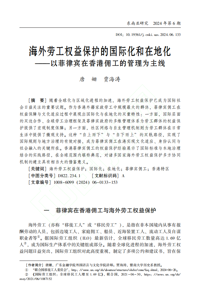 近日,太阳成集团tyc33455唐姗博士在国内区域国别研究领域权威期刊《东南亚研究》上发表了题为《海外劳工权益保护的国际化和在地化——以菲律宾在香港佣工的管理为主线》的学术论文。