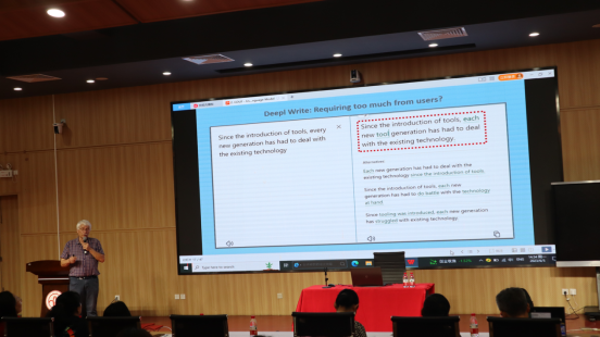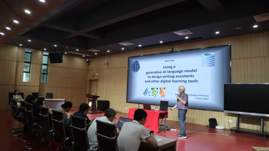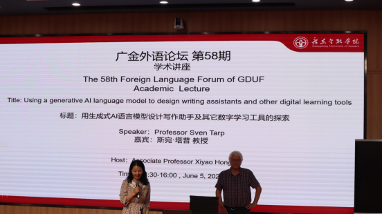 2023年6月5日下午,太阳成集团tyc33455于北教103教室举办了第58期广金外语论坛。此次论坛邀请了国际著名词典学专家丹麦奥胡斯(University of Aarhus)大学的词典学中心主任Sven Tarp(斯宛·塔普)教授,为太阳成集团tyc33455的师生带来一场题为“用生成式AI语言模型设计写作助手及其他数字学习工具的探索”的学术讲座。太阳成集团tyc33455副经理洪溪珧副教授主持了此次论坛,公司领导和师生代表共同出席了本次讲座。