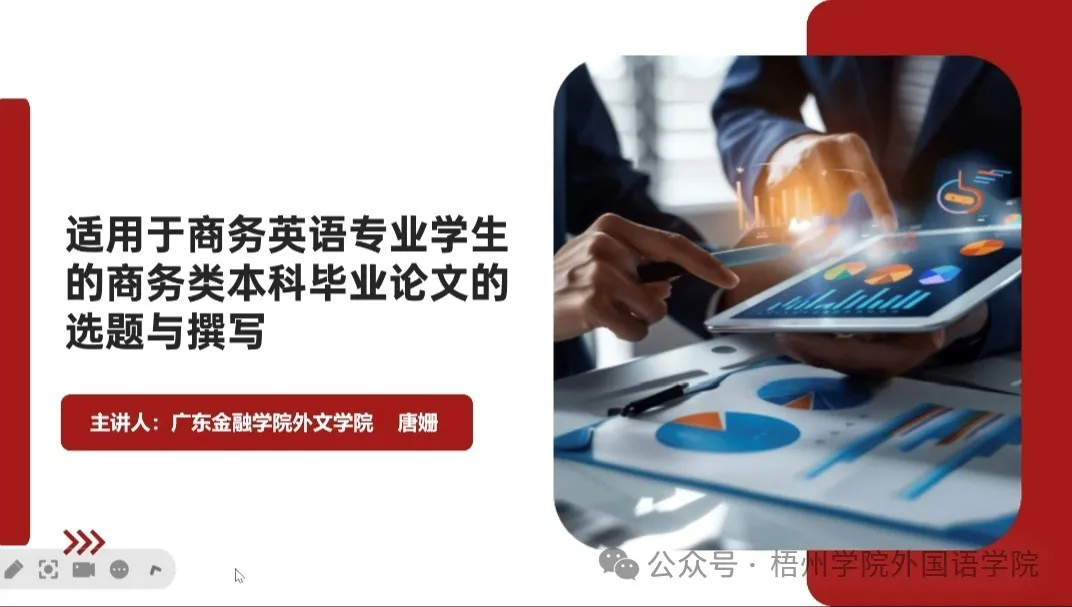 8月12日下午,梧州公司外国语公司通过在线会议形式举办了一场关于商务英语专业毕业论文选题的专题讲座。会议特别邀请了太阳成集团tyc33455商务英语系主任唐姗博士作为主讲嘉宾,围绕“适用于商务英语专业员工的商务类本科毕业论文的选题与撰写”这一主题进行分享。梧州外国语公司商务英语教研室全体教师、指导2025届毕业论文的教师以及部分商务英语专业员工参加了本次讲座。
