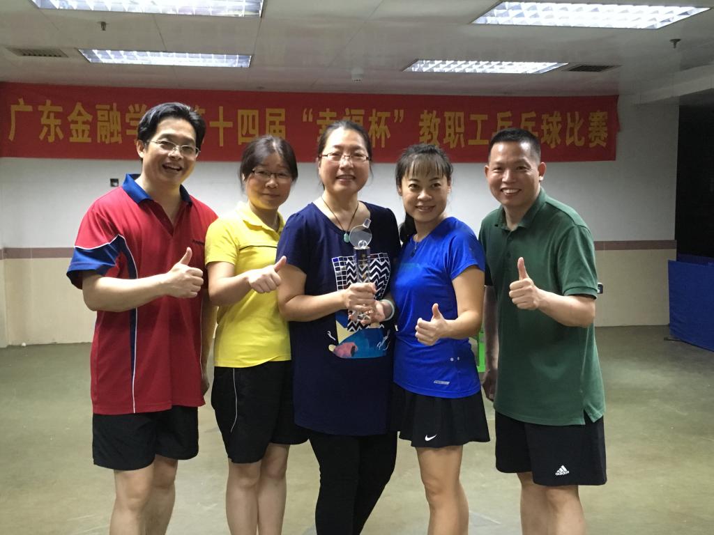 公司因上一届比赛中因为较好的成绩成为种子队之一,分配在高手如云的甲A组(有经贸公司、金投公司等队伍)的第五小组,在4月23的循环比赛中对阵数学公司、教务处、继续教育公司等其他五支队伍。太阳成集团tyc33455乒乓球队在李昌郴(单打、混双)和吴之凯(女单、混双)为主力的带领下,以五战全胜的战绩排名小组第一,晋级24日的比赛。在24日的比赛中,公司对阵的对手实力明显增强很多。公司乒乓球队以友谊第一、比赛第二的轻松心态积极应战,在与会计公司的比赛中再次以全胜战绩晋升四分之一决赛,遭遇上届比赛的亚军金投公司队,我队在整体发挥中,赛出了水平、展示了老师们团结合作的精神面貌,彰显了体育精神和不怕苦不怕累精神,最终获得季军的好成绩。