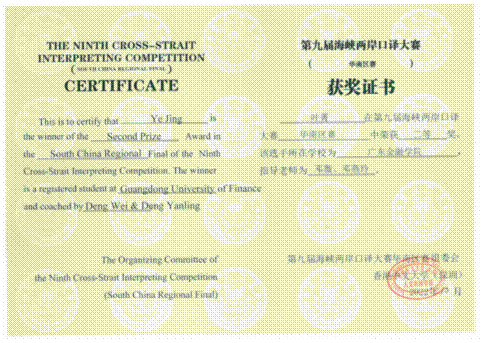 太阳成集团tyc3345519级员工叶菁(191598115)于2022年10月23日代表太阳成集团tyc33455官方网站参加了线上进行的第九届“海峡两岸口译大赛”华南区赛。本次区赛选手来自广东、福建、海南、广西四个省份,参赛16所高校中包括华南理工大学、华南师范大学、暨南大学、广东外语外贸大学、深圳大学、海南大学、广西大学、福建师范大学等省内外著名高校。公司选手在第一轮淘汰赛中以出色表现晋级决赛,并最终取得二等奖的好成绩。