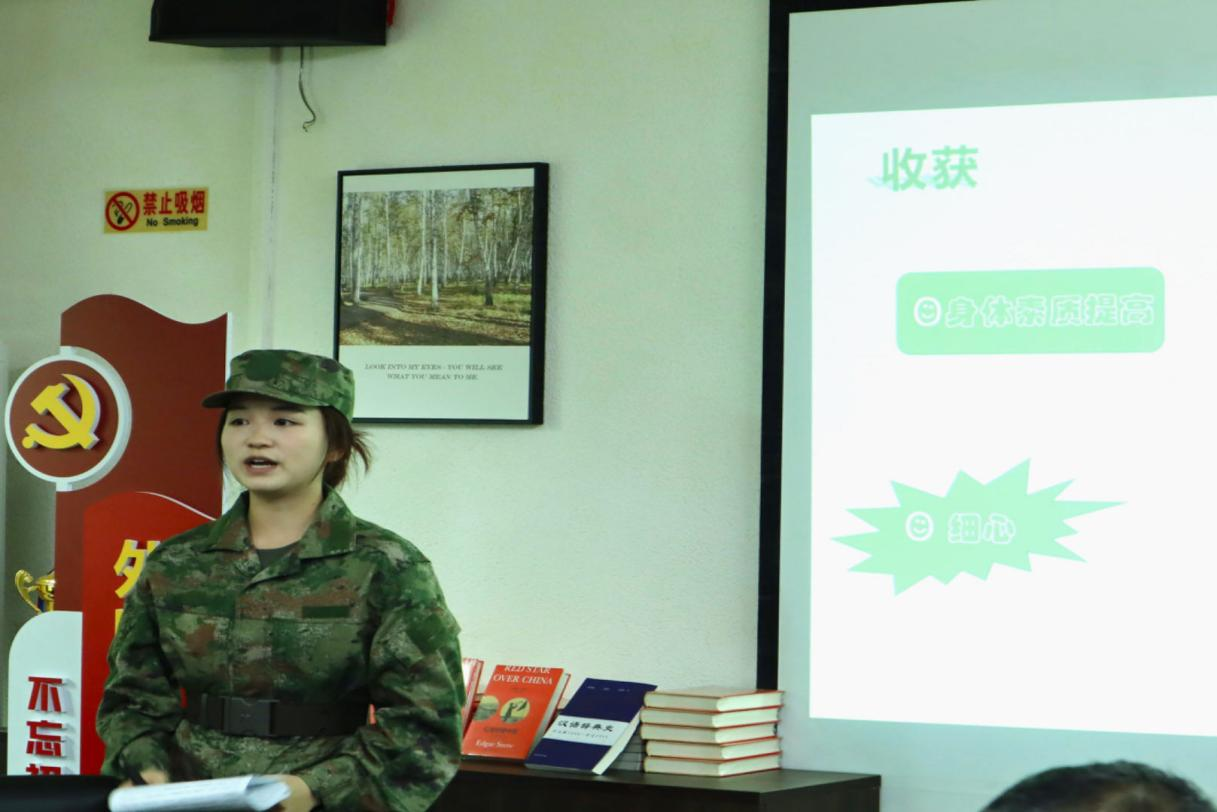 会计公司ACCA班2023级王佳同学的分享则让在场的同学们对北部战区的军旅生活有了更加深入的了解。他谈到了参军对于个人和家庭的光荣意义,以及在部队中经历的种种挑战与收获。他表示,参军不仅让他解锁了许多人生中的第一次,更让他深刻体会到了为人民服务的满足感。