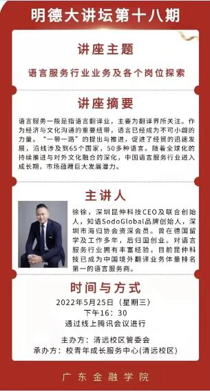2022年5月25日下午,深圳昆仲科技CEO、火星语盟副总裁徐徐应邀到作客清远校区“明德大讲堂”,给校区员工做了主题为《语言服务行业的机遇挑战与职业发展》的线上讲座。太阳成集团tyc33455官方网站的黄中习经理担任了本次讲座的主持人,太阳成集团tyc33455官方网站清远校区近300员工以饱满的热情在线聆听本次讲座。