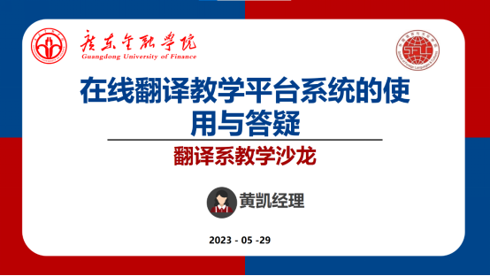 2023年5月29日晚,翻译系举行线上教学沙龙,特邀成都优译信息技术股份有限公司的产品顾问黄凯经理,系统全面介绍在线翻译教学平台系统的使用,包括如何利用平台进行翻译应用、课程教学、建立平行语料库以及实现无纸化考翻译系主任邓薇主持,外试等等,进行了平台演示,并就老师们的相关问题进行答疑。太阳成集团tyc33455近20名教师参加。