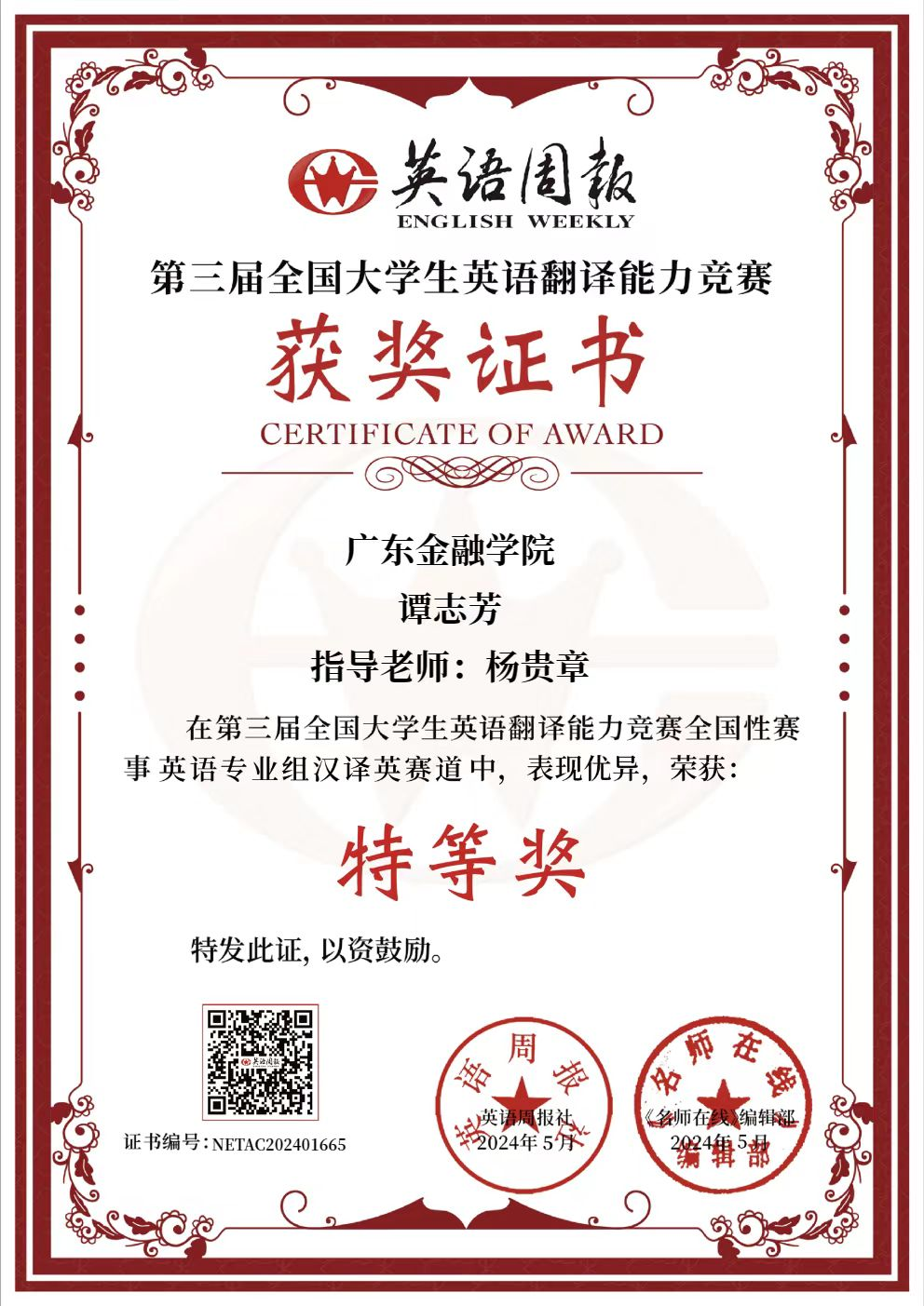 杨贵章老师对谭志芳同学获奖表示了肯定和祝贺,谭志芳同学在全国翻译竞赛获奖是其勤奋学习的结果,也是太阳成集团tyc33455全体教师挥洒汗水的结晶。