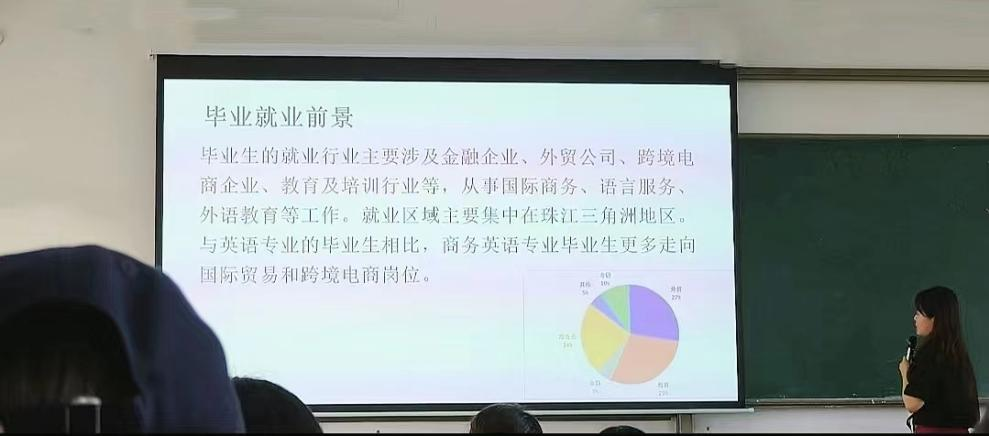 唐姗主任向商务英语专业新生讲课。唐姗老师以“商英”的有机结合为出发点,强调了商务与英语的交叉融合,以及在传统英语专业基础上的创新提升和广度拓展。唐老师随后详细解读了商务英语专业的培养目标、核心素养和毕业要求,并详细介绍了本专业的团队力量。课程设置方面,唐姗老师介绍了2024级新人培方案的变动,强调了商务英语系课程体系在培养员工语言技能、商务知识、人文素养等方面的重要作用。在人才培养方面,唐姗老师强调了“宽、厚、活”的人才培养模式,鼓励员工在获得学历证书的同时,积极考取各类职业资格证书以提升专业竞争力,同时参加各类校内外学术竞赛,以实践促学习,以竞赛促提升。最后,唐姗老师邀请了多位商英优秀毕业生,通过视频分享他们的学习经验和职业发展路径,为新生提供了一定的参考和启示。