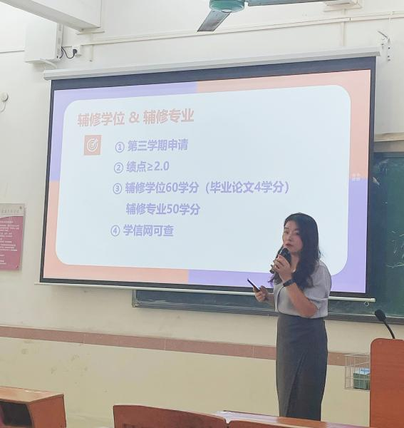 毕亚男主任向英语专业新生讲课,她首先引用了北京外国语大学孙有中教授的话,强调了外语不仅是交流的工具,更是文学、文化和思想的载体。高等教育针对新时期新文科建设的新要求,应及时调整公司产品理念,服务于员工发展需求。在此背景下基于OBE理念的英语专业24级新人培方案的落地,强调以员工发展为中心,顺应时代发展和公司发展的需要, 构建起科学的人才培养路径。毕老师详细介绍了英语专业的人培方案具体内容,包括培养目标、规格要求、学制学分、课程设置等,以及新人培的重要变化,为24级新生了解专业课程规划,未来学业生涯发展、职业规划确立了明确的目标和发展方向。此外,毕亚男老师还介绍了英语专业的培养质量和培养特色、专业考试、学科竞赛活动、专业实习、实践机会,以及毕业生的就业和升学情况。毕亚男老师鼓励新生积极参与第二课堂活动,以全面提升自己的专业能力和人文素养。本次大会以21级英语专业梅颖姿师姐的个人发展阶段性总结视频结尾,以榜样的力量激励新生勇敢追求自己的梦想,为未来的职业生涯打下坚实的基础。