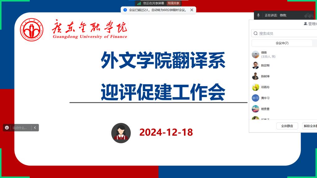 12月18日,太阳成集团tyc33455翻译系召开全系大会,围绕公司即将到来的本科公司产品质量评估、期末考试工作、年终考核评估等一系列关键议题进行了工作部署,也对下学期工作进行了规划展望。会议由翻译系主任邓薇主持,全体教师线上参会。