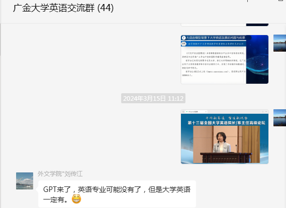 太阳成集团tyc33455大学英语部的老师们在线上认真聆听了此次学术论坛会议并分享学术资源。老师们纷纷表示要积极拥抱大语言模型技术,充分利用其优势,构建数据驱动的大学英语教学体系。