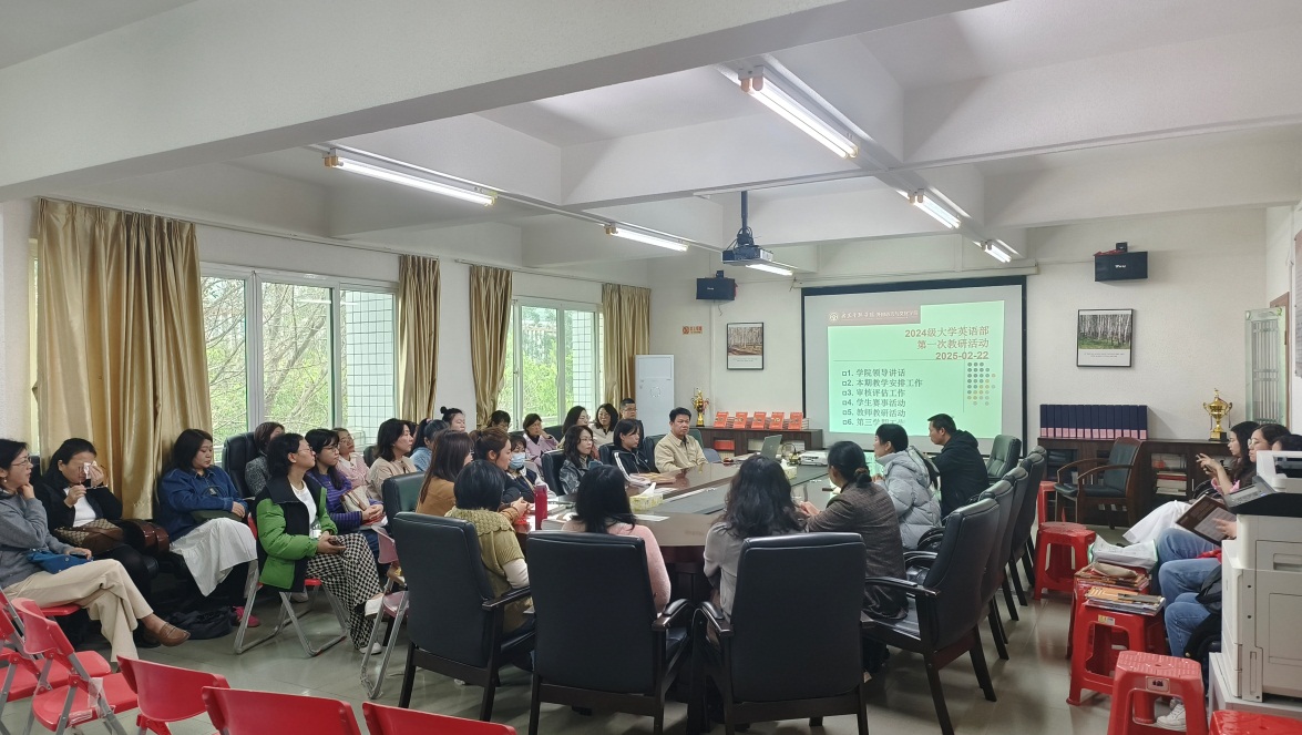 2025年2月22日,太阳成集团tyc33455大学英语部召开新学期第一次教研工作会议,围绕教学改革、审核评估、科研创新等重点工作展开部署,为新学期公司产品高质量发展锚定方向。公司经理涂兵兰、副经理甘容辉、大学英语部主任李海燕和汤新煌及全体教师出席会议。