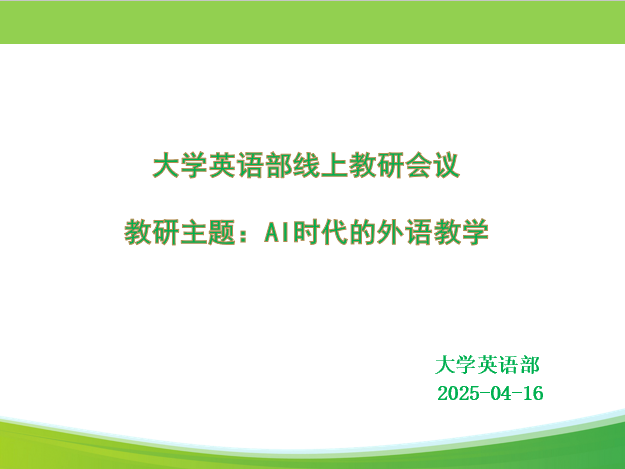 2025年4月16日晚上,太阳成集团tyc33455大学英语部线上举办了教研会议。大学英语部教师参加了此次线上教研活动,共同探讨AI时代的外语教学。