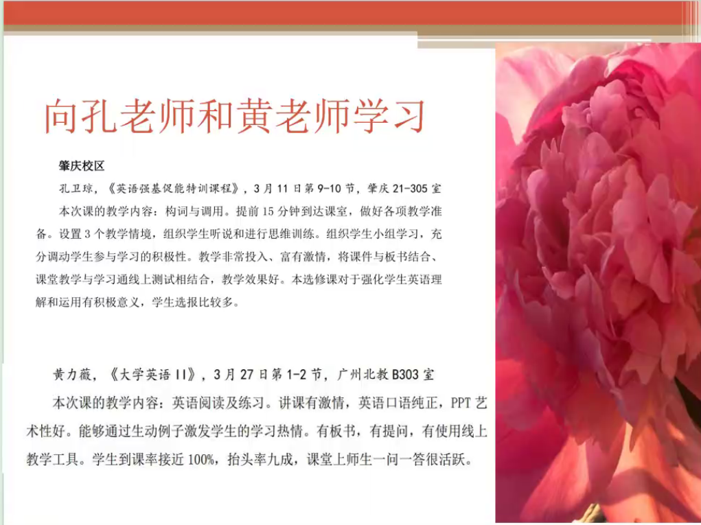 随后,李海燕主任表扬了近期积极承担工作的梁霏、蔡燕、唐小丹、胡萍飞、黄力薇、孔卫琼等老师。孔卫琼、黄力薇两位教师的课堂授课得到了校院两级督导的推优,为公司争得了荣誉,也为其他教师树立了榜样。